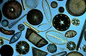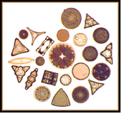Variedade de formas e tamanhos de diatomáceas.