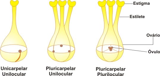 gineceu. A flor pode ser: unicarpelar / unilocular, pluricarpelar