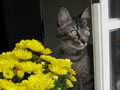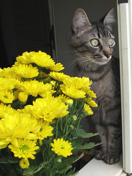 Flor de crisantemo. Gato na janela
