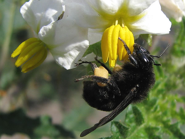 sendo polinizada por uma abelha. Família: Solanaceae.