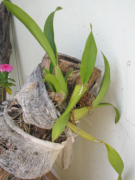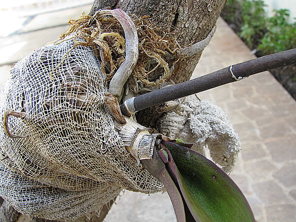 plantada em um tronco, fixa com gaze juntamente com o subtrato.