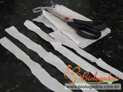 4. Barbante macio ou tiras finas de tecido de algodão ou gaze. Tesoura.